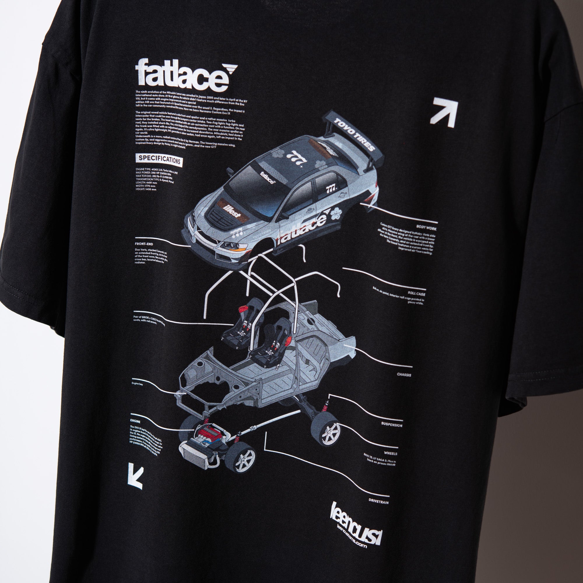The Leen Customs "FatLace Evo IX" Staple Tee, is a midweight cotton and cut with a regular fit. A short sleeves give the wear-everywhere piece its classic touch. A small tonal size tag is printed on the inside collar and printed with a breakdown of the Mitsubishi Evo IX in collaboration with Fatlace and @real.norman.ray